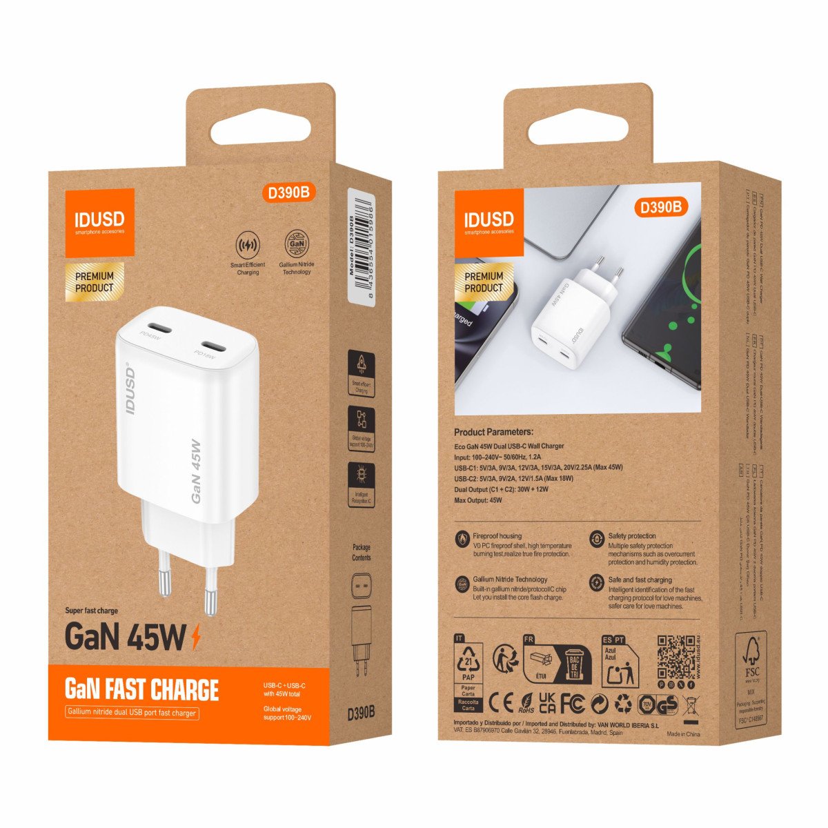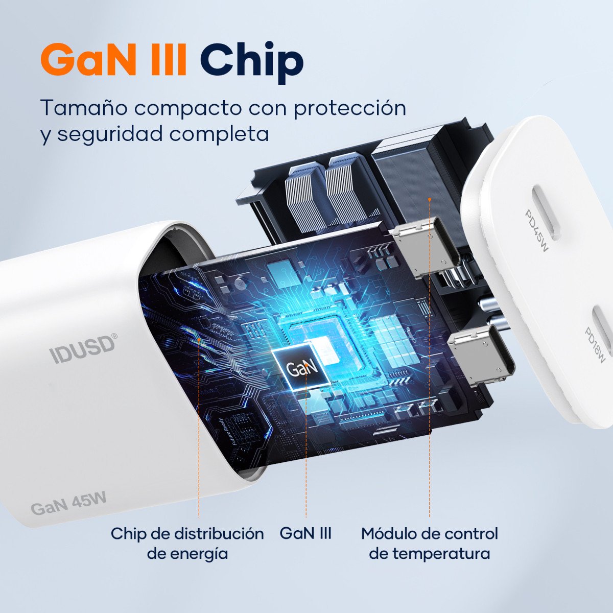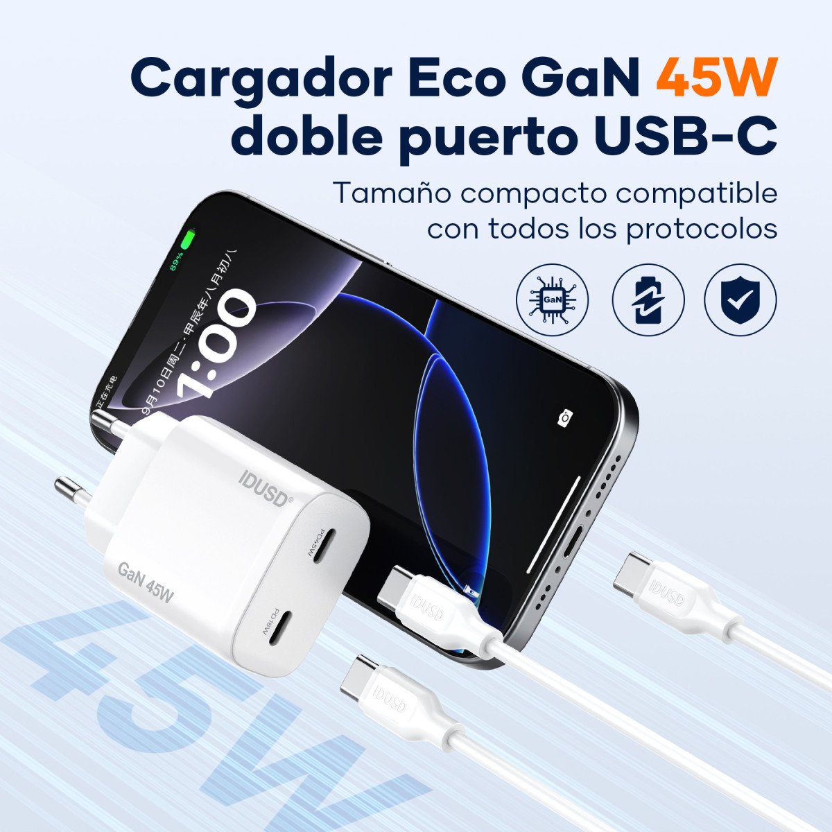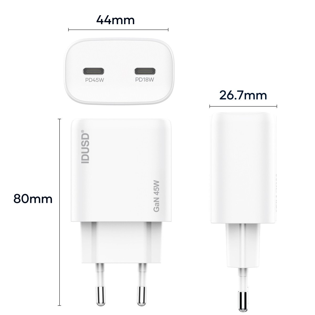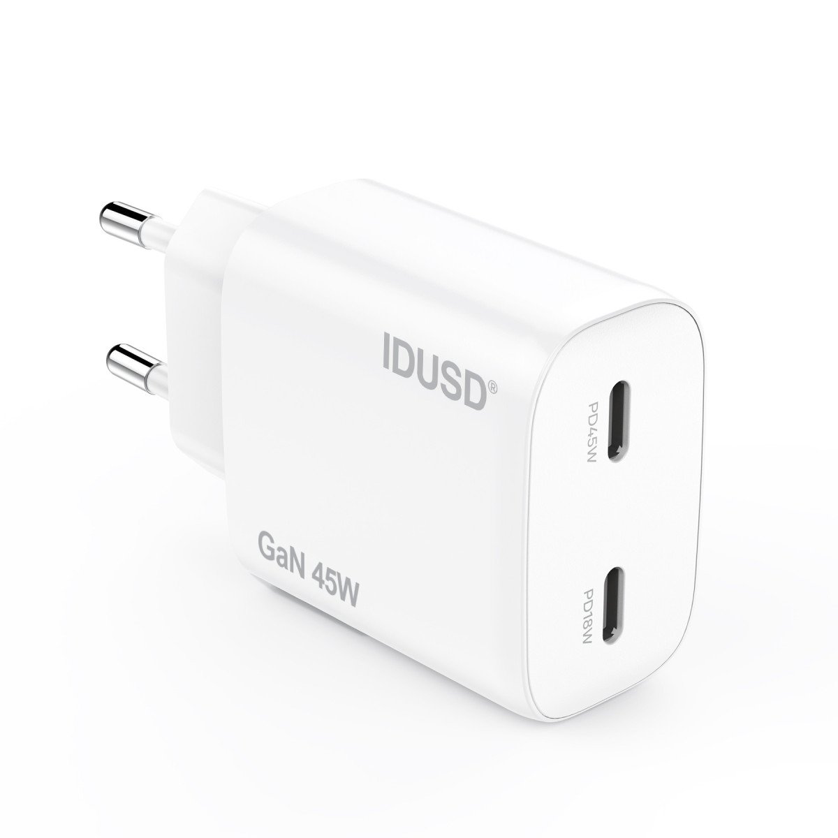 The GaN PD45W C+C Charger combines power, efficiency, and portability in a sleek 27mm compact design. Equipped with dual USB-C ports and GaN technology, it delivers fast, safe, and stable charging for multiple devices — all in a modern and functional form factor.