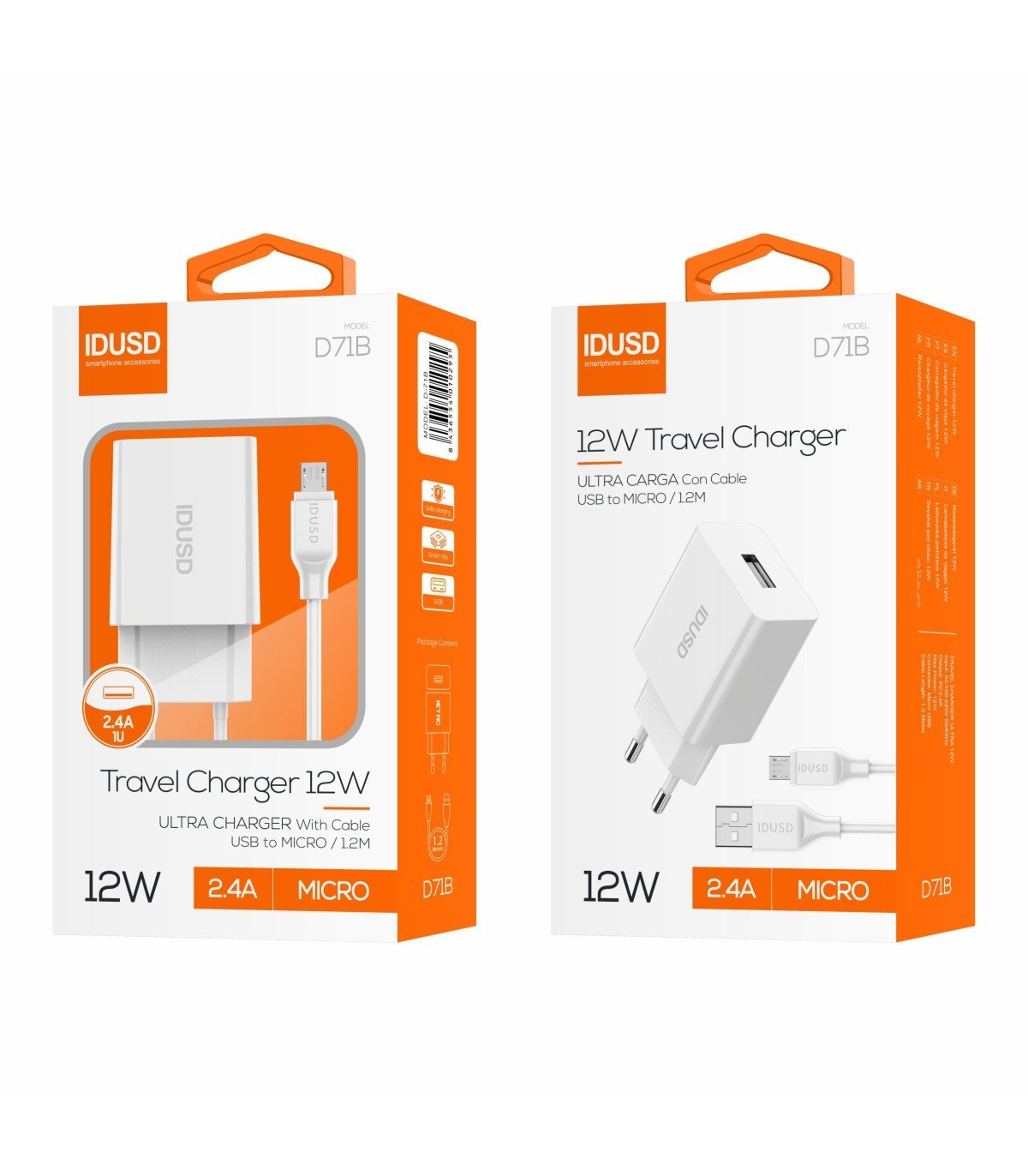 Smart Charger 1U 2.4A + Micro-USB – D71 con diseño funcional y tecnología moderna. Ideal para el uso diario, viajes o trabajo. Compatible y práctico para múltiples dispositivos.