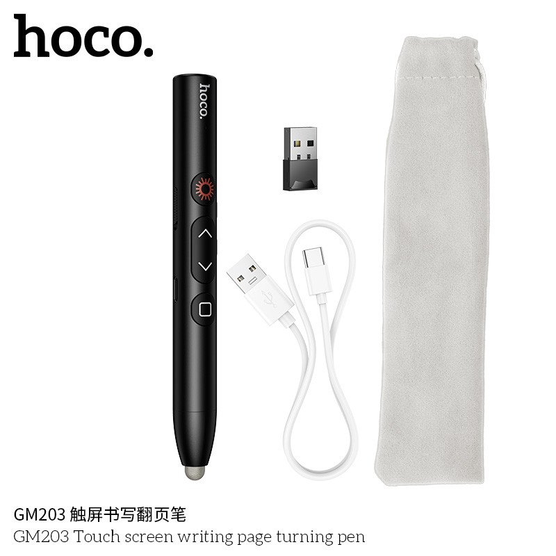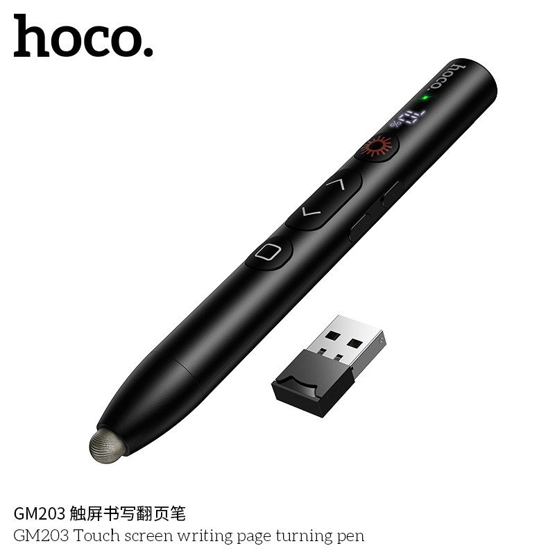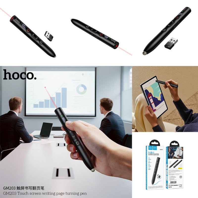 The Hoco GM203 Multifunction Touch Pen is a versatile tool designed for presentations, teaching, office work, and touchscreen navigation. It combines a stylus, red laser pointer, page-turn controller, and a digital battery display—all in one lightweight device.