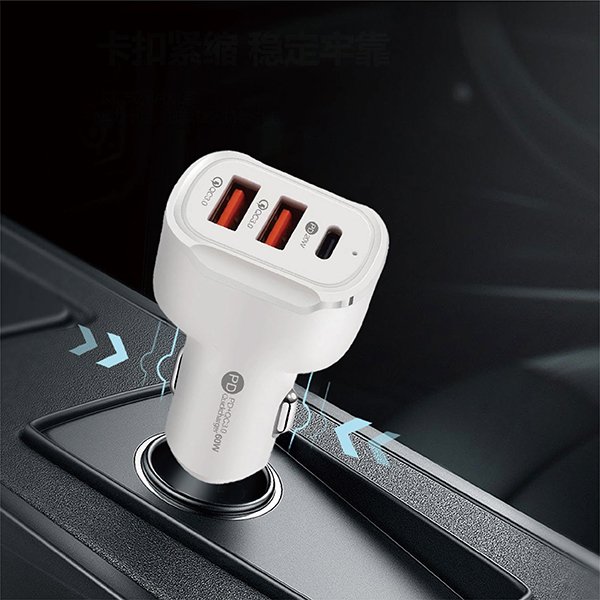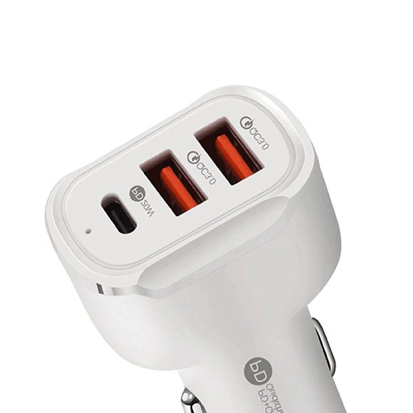 Cargador de coche rápido y eficiente con tres puertos: dos USB-A y un USB-C con Power Delivery de hasta 60W. Perfecto para cargar varios dispositivos al mismo tiempo mientras conduces. Diseño compacto y resistente, compatible con todos los modelos de coches.