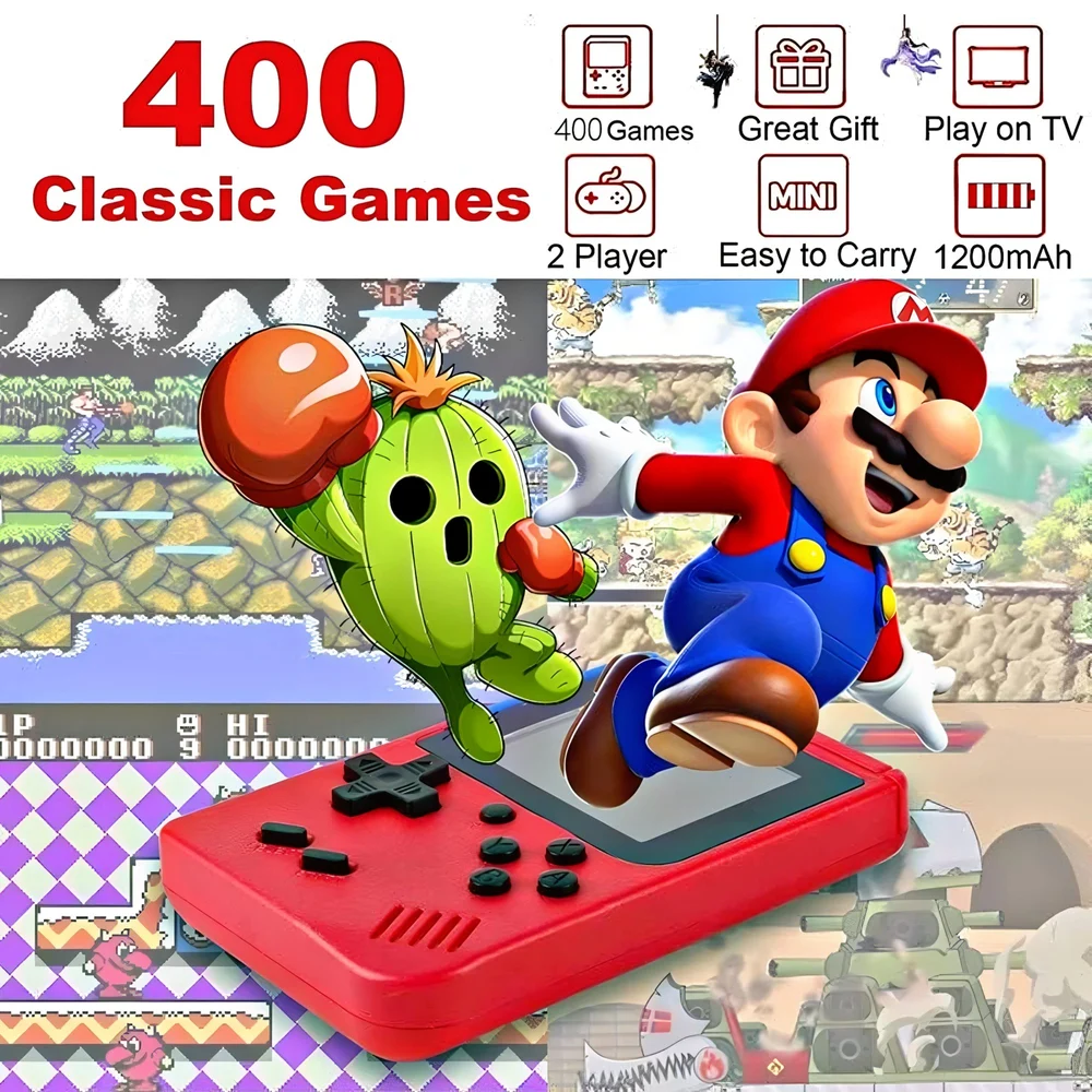 ✔️ 400 juegos clásicos integrados ✔️ Incluye títulos legendarios como Super Mario, Contra, etc. ✔️ Pantalla integrada para juego portátil ✔️ Salida AV para TV – juega en pantalla grande 📺 ✔️ Batería recargable por USB 🔋 ✔️ Diseño compacto y ligero