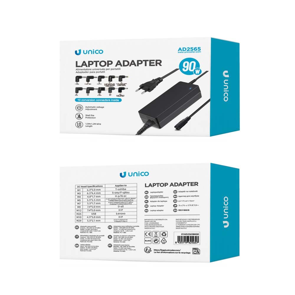 El adaptaFdor UNICO AD2565 de 90W es compatible con la mayoría de portátiles, ofreciendo una carga rápida y segura. Ideal como reemplazo o cargador adicional.