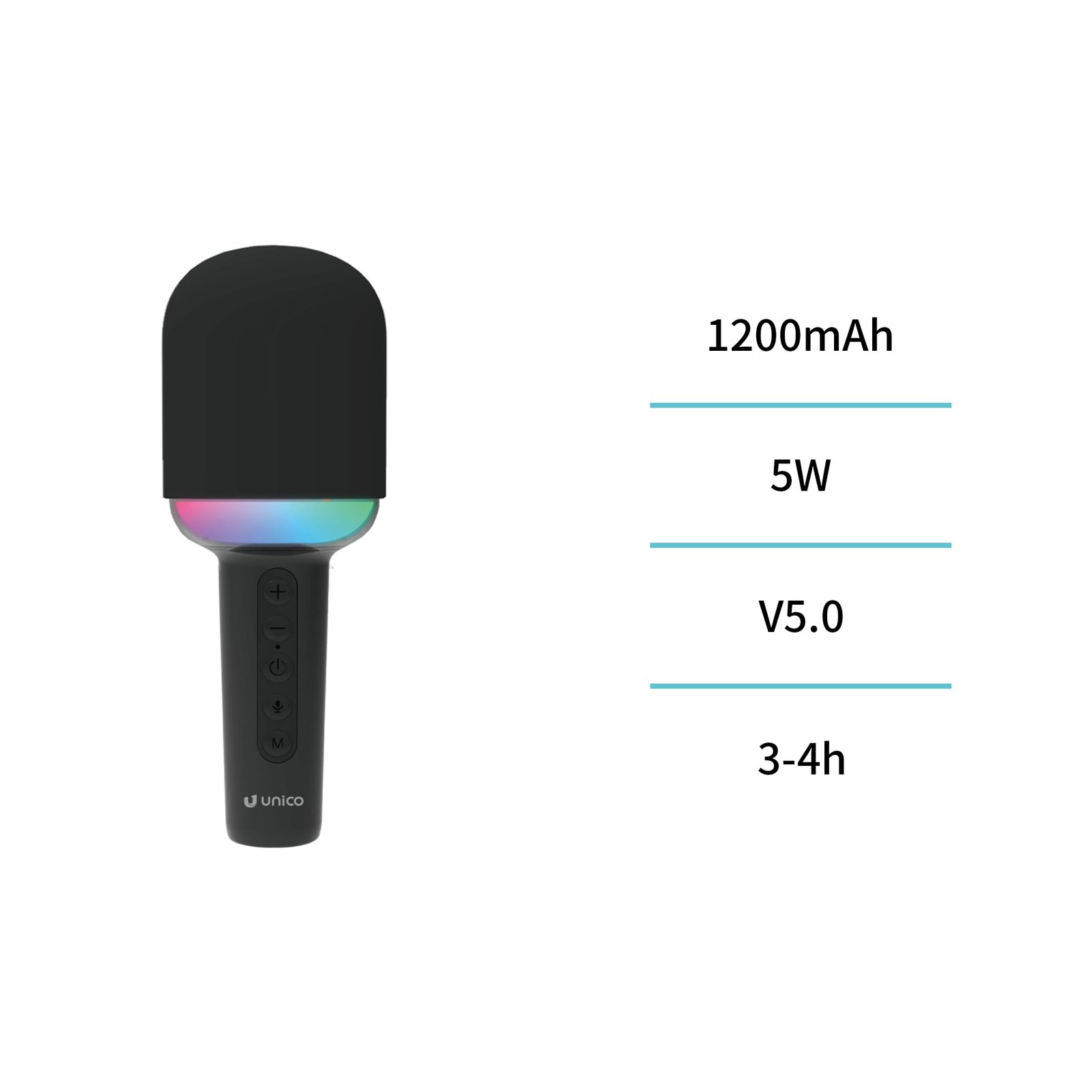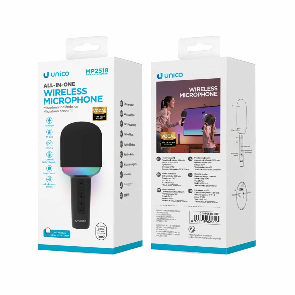 Micrófono inalámbrico de alta calidad con diseño compacto y elegante en color negro. Perfecto para karaoke, presentaciones, podcasts y llamadas. Fácil de usar y compatible con múltiples dispositivos Bluetooth.